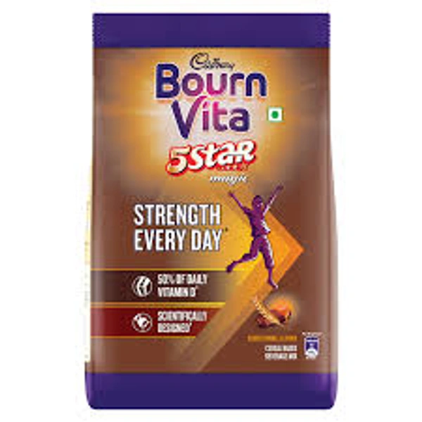 Cadbury Bournvita 5 Star Magic Health Drink with caramel flavour is a scientifically designed formula, crafted by nutritionists with a bundle of nutrients that are known to support Physical strength (Calcium, Vitamin D and Magnesium are known to maintain Bone and Muscle health); Mental Strength (Iron, Iodine and Zinc which help in normal cognitive functions); Immune strength (Vitamin C, Vitamin D, Zinc and Iron to support the immune functions). Thus, supporting strength and providing high energy. 2 serves of Bournvita provide 50% RDA of Vitamin D (Recommended Dietary Allowance requirement for children (7-9 years), ICMR -NIN, 2020). Bournvita chocolate drink to be consumed as a part of a daily balanced diet and healthy lifestyle