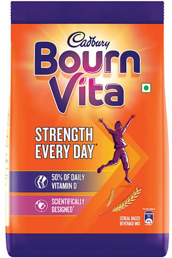 Cadbury Bournvita Chocolate Health Drink is a scientifically designed formula, crafted by nutritionists with a bundle of nutrients that are known to support Physical strength (Calcium, Vitamin D and Magnesium are known to maintain Bone and Muscle health); Mental Strength (Iron, Iodine and Zinc which help in normal cognitive functions); Immune strength (Vitamin C, Vitamin D, Zinc and Iron to support the immune functions). Thus, supporting strength and providing high energy. 2 servings of Bournvita provide 50% RDA of Vitamin D (Recommended Dietary Allowance requirement for children (7-9 years), ICMR -NIN, 2020)—Bournvita chocolate drink to be consumed as a part of a daily balanced diet and healthy lifestyle