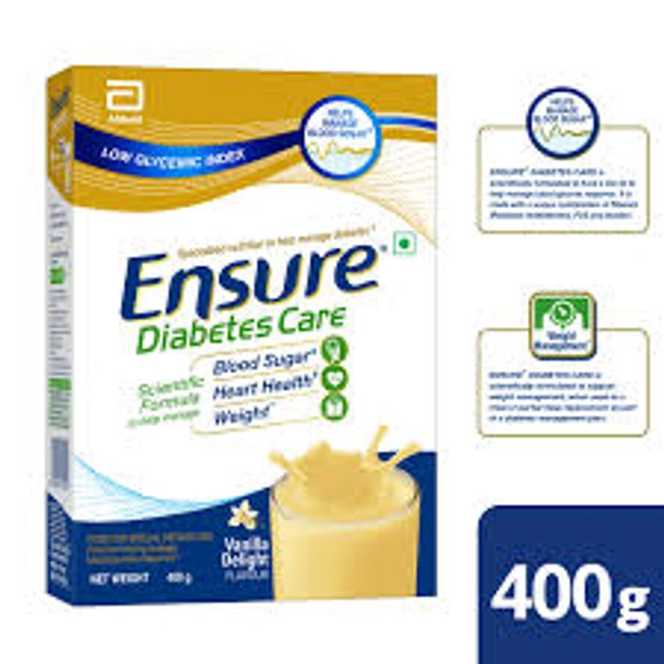 Ensure Diabetes Care is the leading diabetes-specific nutritional supplement drink worldwide, offering a unique scientific formula to assist in managing blood sugar, weight, and heart health. This scientifically formulated nutrition has been clinically proven in Indian patients. With 36 essential nutrients, including proteins, vitamins, fibre, minerals, and MUFA-rich fat blend, slow-release carbs, it promotes heart health while effectively managing blood glucose. Designed as a complete, balanced nutrition for individuals with diabetes, it ensures steady energy throughout the day while helping to regulate blood glucose levels. Additionally, this drink provides high protein content, supporting muscle health crucial for strength and mobility, along with vital vitamins and minerals.