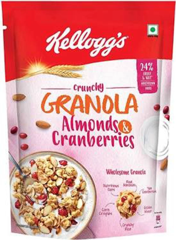 New Kelloggs Crunchy Granola is an irresistibly tasty way to start your day. Enjoy baked, multigrain clusters of whole-grain oats, wheat, corn, rice and barley, generously loaded with real almonds and cranberries. Have it with milk or as is, for a tasty, nourishing start to your day. Kelloggs Crunchy Granola has 24% Fruit and Nut - it is loaded with yummy cranberries and real almonds to give your day the perfect start. It comes with multigrain goodness and the power of 5 nutritious grains - Oats, Wheat, Corn, Rice and Barley in one delicious breakfast. Kelloggs Crunchy Granola also has the goodness of fibre. It is naturally cholesterol-free