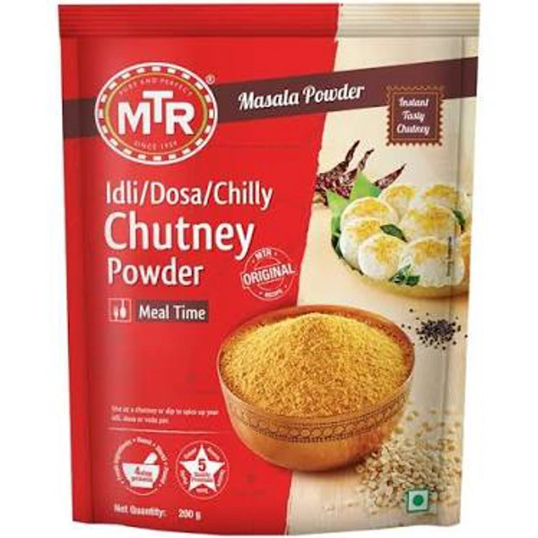 MTR Chutney Powder can be a fine accompaniment for idli, dosa, vada pav, dal or chapatti. This instant tasty mix can be used to prepare a tangy spicy chutney. The chutney powder is prepared with the freshest of ingredients which are pounded to perfection to give you a smooth blend