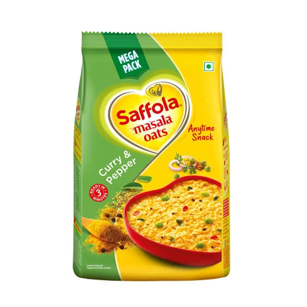 Saffola Masala Oats brings to you a range of delightful flavours making for a perfect evening snack. Made with whole grain oats, real vegetables & a tasty mix of authentic desi spices, Saffola Masala Oats forms a delectable warm bowl of joy. What's more, is that it is ready to eat in just 3 minutes - super convenient to make, super tasty to eat, and super hard to resist! You can also enjoy Saffola Masala Oats in a variety of tasty recipes like Crispy Cutlets, Penne Pasta, or just as a delicious bowl of joy with crunchy toppings like namkeen, peanuts or crushed papad. Saffola Masala Oats is available in a range of lip-smacking flavours - Classic Masala for the classic masaledar experience | Veggie Twist for the comforting blend of spices and vegetables | Peppy tomato for a tangy indulgence | Masala Coriander for the tasty mix of desi spices with coriander notes | Curry & Pepper with a lingering aroma of curry leaves. Made with wholegrain Oats & real vegetables, Saffola Masala Oats is high in fibre and protein keeping you fuller for longer, helping you control your hunger pangs and manage weight