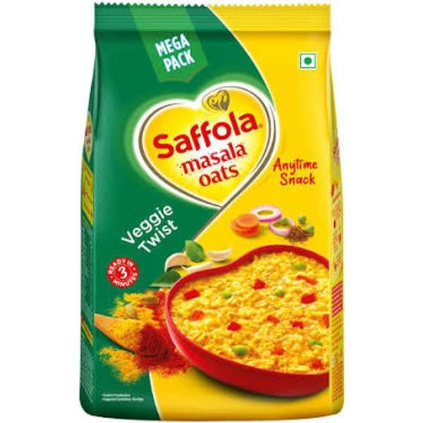 Saffola Masala Oats brings to you a range of delightful flavours making for a perfect evening snack. Made with whole grain oats, real vegetables & a tasty mix of authentic desi spices, Saffola Masala Oats forms a delectable warm bowl of joy. What's more, is that it is ready to eat in just 3 minutes - super convenient to make, super tasty to eat, and super hard to resist! You can also enjoy Saffola Masala Oats in a variety of tasty recipes like Crispy Cutlets, Penne Pasta, or just as a delicious bowl of joy with crunchy toppings like namkeen, peanuts or crushed papad. Saffola Masala Oats is available in a range of lip-smacking flavours - Classic Masala for the classic masaledar experience | Veggie Twist for the comforting blend of spices and vegetables | Peppy tomato for a tangy indulgence | Masala Coriander for the tasty mix of desi spices with coriander notes | Curry & Pepper with a lingering aroma of curry leaves. Made with wholegrain Oats & real vegetables, Saffola Masala Oats is high in fibre and protein keeping you fuller for longer, helping you control your hunger pangs and manage weight