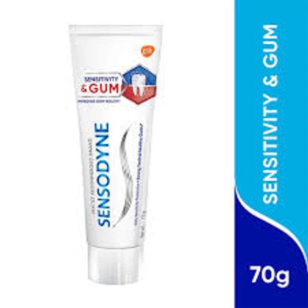 Often, tooth sensitivity and gum problems go hand in hand. When the protective layer of teeth (enamel) is worn away or gums recede, the dentine underneath becomes exposed. When the exposed dentine comes in contact with hot, cold, sweet or sour food and drinks, it can trigger a sharp short sensation called tooth sensitivity. Meanwhile, Gum problems are caused by a build-up of plaque bacteria. Sensodyne Sensitivity & Gum is a daily fluoride toothpaste that helps protect against tooth sensitivity and improves gum health, while still providing the benefits of a regular paste. This toothpaste has a low abrasion, dual action formula. It protects the teeth against sensitivity and helps target & remove plaque bacterial for healthy gums. With twice daily brushing, you can enjoy your favorite foods and drinks without the worry of sensitive teeth. Sensodyne Sensitivity & Gum tooth paste is available in two packs - 70 gm and 140 gm (70 gm * 2) combo pack. Always follow instructions and guidance included on the pack before use.