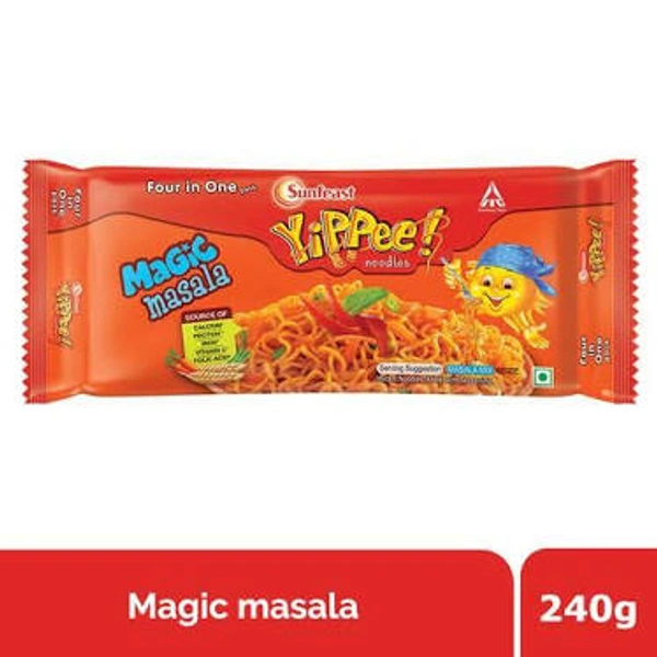 Looking for a snack filled with magic, masala and masti? Then Sunfeast YiPPee! Magic Masala Noodles is just what you were looking for. Every bite will simply dazzle your taste buds. Made with the finest ingredients and the goodness of real vegetables. YiPPee!'s delicious mix of Indian spices give it the much-loved magical masala taste. The goodness of vegetables adds more texture and a healthy dash of colour to every bite of Noodles! Super quick, deliciously tasty, and utterly wholesome! The kids will love it and so will you! A delicious noodle treat loaded with nutrients such as Calcium, Iron, Vitamin C, Folic Acid and Protein, all of which are essential for maintaining good health. Sunfeast YiPPee! Magic Masala Noodles comes packed in a unique round block, ensuring that your noodles remain long, non-sticky and super slurpy every time. So, each time you sit down to devour this treat, expect the same mouth-watering and deliciously slurpy experience like last time. Relish them as a wholesome breakfast treat or as an exciting evening snack or even as a quick midnight meal, the choice is all yours. Whenever those hunger packs need to be taken care of, YiPPee! Magic Masala Noodles is your go-to snack.