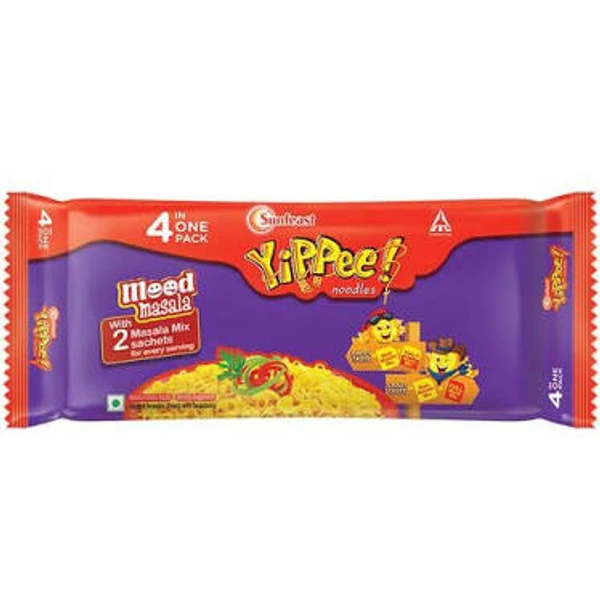 Sunfeast Yippee Noodles Mood Masala is the instant snack for those instant cravings you have. Packed with two masala blends to satisfy every mood and palate. We understand that it might be challenging to keep track of your constantly shifting moods, so we've provided a snack that will work for all of them. Simply add the main masala mix, followed by the mood mix of your choice, and presto! You have a tasty bowl of instant noodles tailored to your specifications. This snack is created with delicious Indian spices that harmoniously blend to give you that well-known masaledaar flavour, making it never bland or monotonous. Unique round block packaging guarantees that your noodles will always be long, non-sticky, and slurp able. Considering inviting some guests around for dinner or hoping to surprise the family with a quick meal? No issue! Yippee! The meal to cook for a snack is mood masala instant noodles. Delicious and simple to cook. Enjoy them as a delectable evening snack, a midnight nibble to satisfy a need, or a full meal when you're in the mood for something different. Easy to prepare boil the noodles and ass the masalas. Add tastemaker and ½ Mood masala for a mild taste, and full packet for a crazy, spicy taste. For those who like to experiment with food according to their mood. Thus, you can choose how spicy your noodle is, which makes these brand-new Sunfeast mood masala noodles superior to conventional noodles. You can enjoy your bowl of Sunfeast noodles with the ordinary masala mix instead of the mood masala mix if you're not in the mood. So, shop now only on Big Basket and have it delivered to your home and make snacking fun. Available in many sizes so can be enjoyed by all. Single pouch to enjoy those solo movie nights or multipack to enjoy with friends and family. There is a size for every occasion. Thus, with only a few clicks of the mouse, you can get all your kitchen necessities from BigBasket at fantastic prices, and the items will be delivered safely the following day.